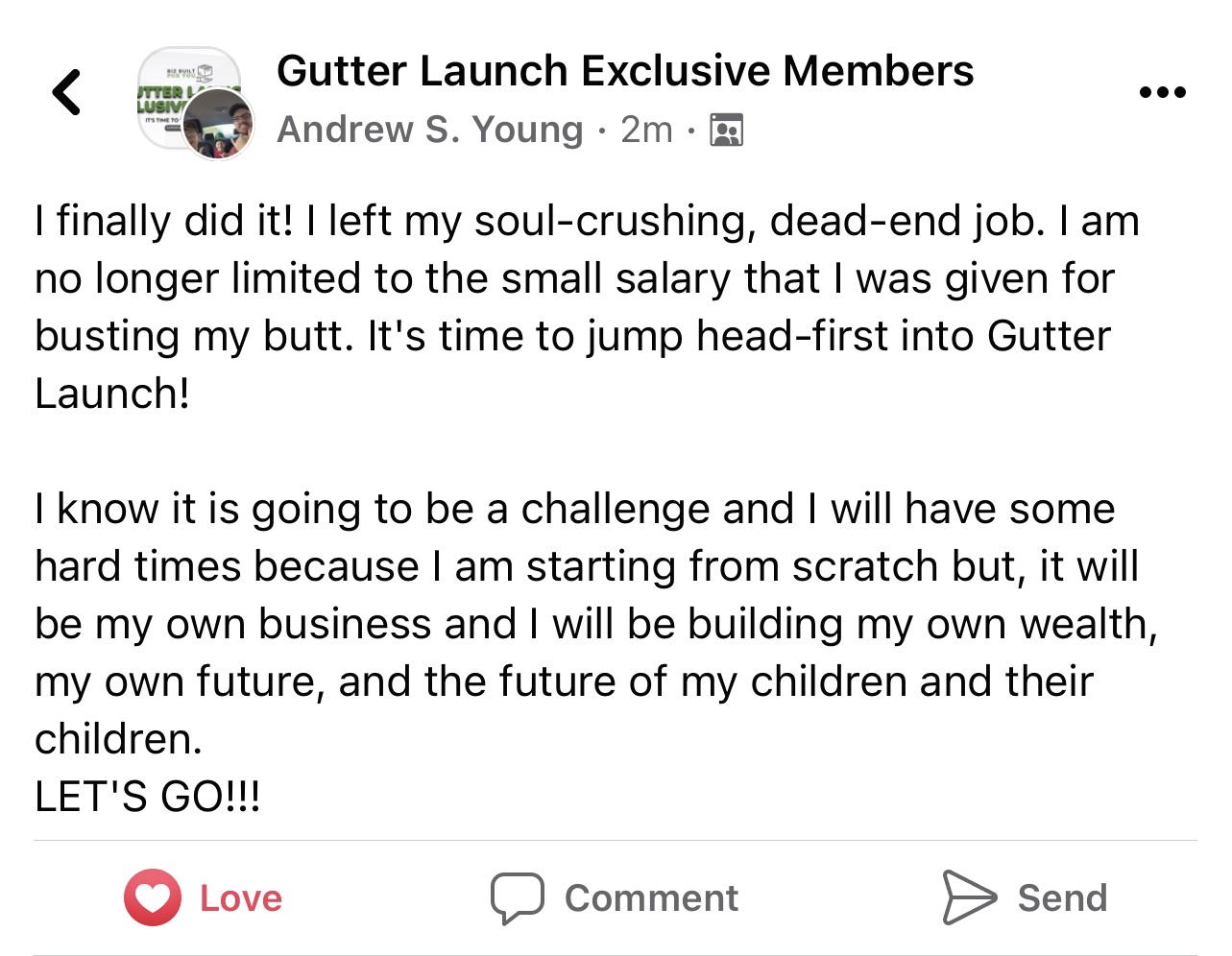 Gutter Launch is going to give you everything you need to build or scale a gutter business. Giving you the step by step from how to set up an LLC to how the tools should be laid out in the truck. Taking all the questions out of it, & allowing you to start seeing income increase in just a few short months.